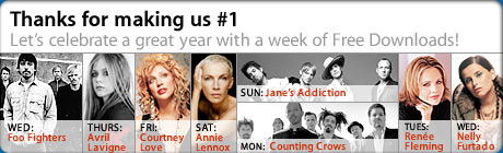 Update: This week, they will be giving away a different song every day. (View graphic). The artists include: Foo Fighers, Avril Lavigne, Courtney Love, Annie Lennox, Jane's Addiction, Counting Crows, Renee Flemming, and Nelly Furtado