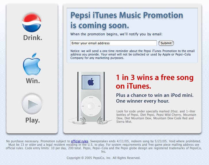 Pepsi has just ended a promotion in Canada featuring an iPod-an-hour giveaway. Apparently the new caps also include one entry into a new iPod-An-Hour giveaway, featuring iPod mini's.